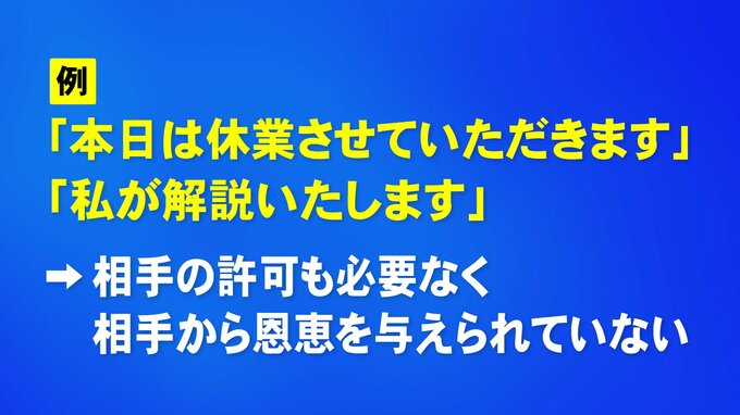 例えば、「本日は休業します」に対する「休業させていただきます」 、 「それでは私が解説いたします」に対する「~ 解説させていただきます 」 のような例を考えてみると、 「本日は休業させていただきます 」の例で は、休業することで店側は別の用事をすますことが出来る恩恵がありますが、相手の許可は必要ない 「それでは 私が解説 させていただきます 」の例も、私が解説をするのに相手の許可は必要なく、相手から恩恵も与えられていないので 、これも適切な使用とは言えない…、 そんな風に感じる人がいるわけです。