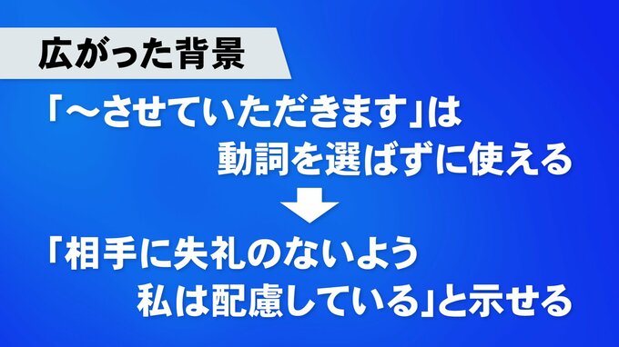 一つは、「説明させていただく」のように名詞に付くとともに、どの動詞にでも学校文法で言う未然形にくっつけて使えるという便利さです。例えば、謙譲表現の「お持ちします」などの「お~する」「お~いたす」といった言い方では、「お~」の「~」の部分に来る動詞にある程度制限があって、どんな動詞にでも使えるわけではありません。その点、「~させていただく」は動詞を選ばないので便利だというわけです。また、どんな動詞に対しても「~させていただきます」と言うことで、場面を問わずに「相手に失礼のないよう私は配慮しています」ということを示せる都合のよさもその原因の一つであるようです。