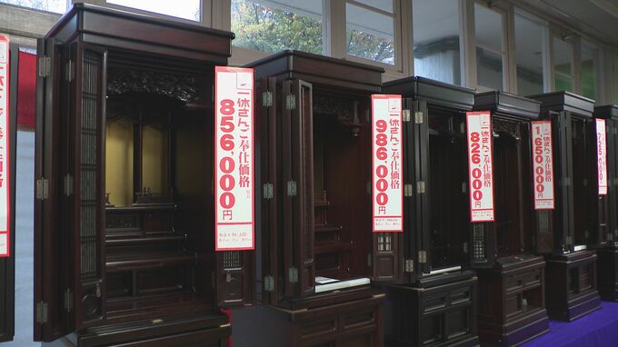 10日から始まった「大仏壇博」は一休さんの米永グループが、毎年春と秋に開催していて、石川県産業展示館2号館には約300の仏壇をはじめ、仏具や掛け軸、墓石などが展示されています。近年、仏間がない住宅が増える中、上置きタイプのお手頃価格や明るい色合いの仏壇が注目を集めています。