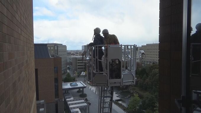 県と金沢市消防局が合同で行っているこの訓練には、県の職員らおよそ300人が参加しました。震度6強の地震が発生したという想定で、エレベーターの中に閉じ込められたけが人を救出し搬送するまでの手順などを確認しました。その後の消防訓練では、備え付けの消火器を使った初期消火や、はしご車による救助活動も行われました。