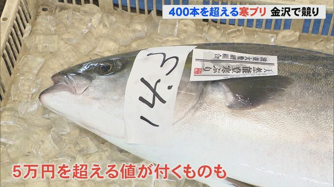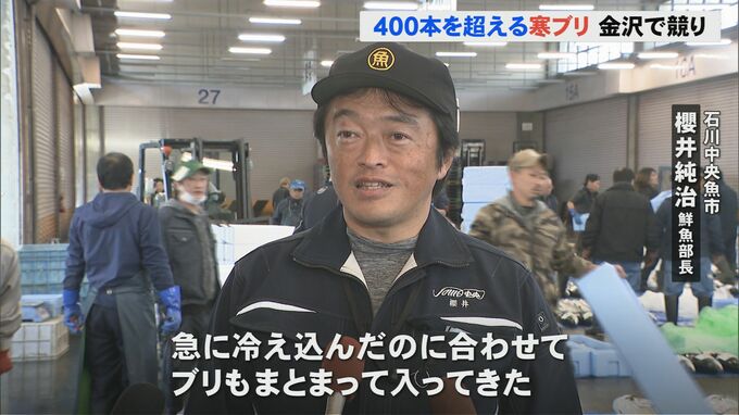 能登町宇出津では14日朝、定置網漁で今シーズン最高となる400本を超えるブリが水揚げされ、午前8時半過ぎには金沢市の中央卸売市場に運ばれ、競りにかけられました。