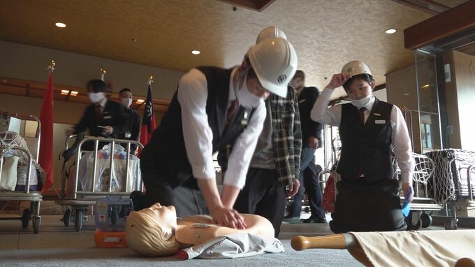 石川県七尾市にある和倉温泉の老舗旅館「加賀屋」で27日、自主防災訓練が行われ、従業員たちが宿泊客の避難誘導や救命措置などの手順を確認しました。