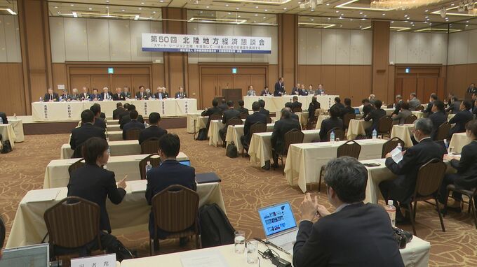 懇談会には北陸3県の会員企業や日本経団連の代表ら110人が出席し、「成長と分離の好循環を実現する」をテーマに意見を交換しました。この中で生産性の向上に向けた支援拡充や、国土強靭化のため北陸新幹線の大阪までの全線開業など社会基盤整備の重要性を強調していました。