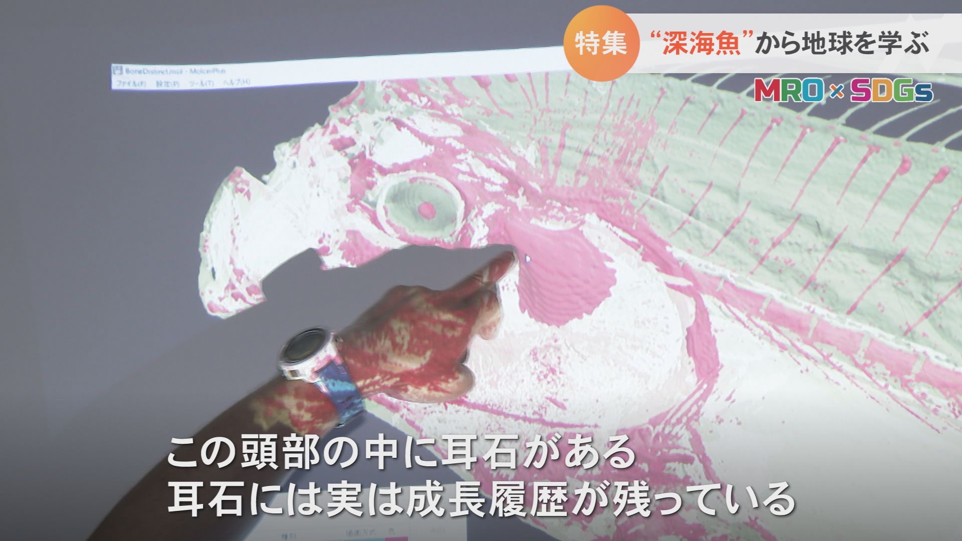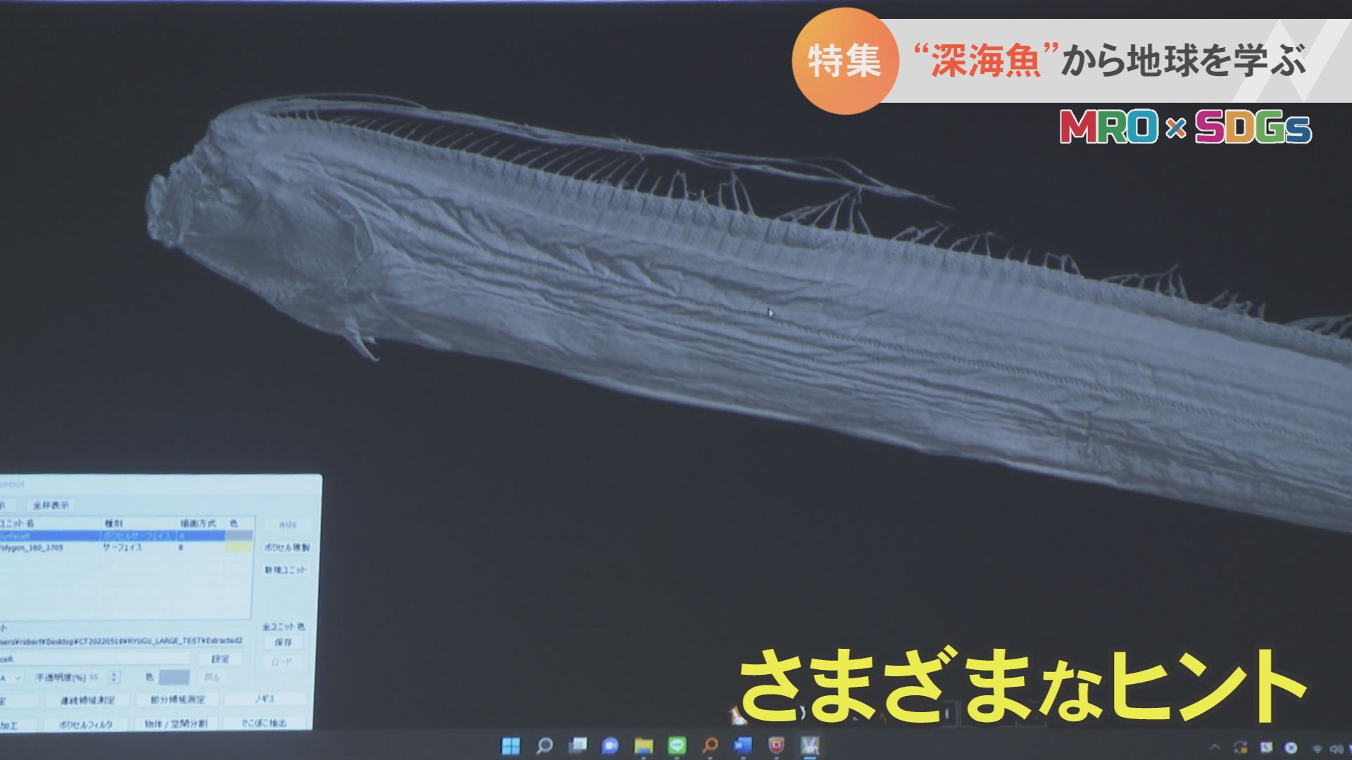 ジェンキンズロバート准教授「人体にCTスキャンを使ったときと同じように骨と肉を分離して検査できる。深海魚は骨が軟化しているようなことがよくあるが、リュウグウノツカイは背側の骨の一部がかなり硬化が進んでいる。なぜこういうことが起きるのか。深海という環境でどんなふうにその骨を作ったりしているのか、その深海へどうやって生物が適応しているのかそういったことがこのCTのデータから得られるといいなと。」