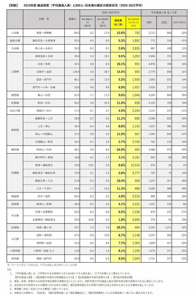 JR西日本は28日、ローカル線を取り巻く環境の変化とともに地域と各路線の実態や課題の共有を目的に、1日の平均通過人員が2000人未満となった17路線30区間の経営状況について情報を開示しました。