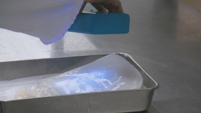 調査では職員がまな板や扉の取っ手をふき取り汚れ具合を調べたり、食材にアニサキスを確認するライトを当てたりしながら、店員に衛生面でのアドバイスを行いました。