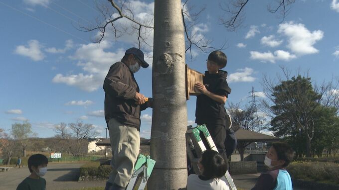 野鳥が住みやすい環境をつくろうと4日、小学生が石川県小松市の木場潟公園に手作りの巣箱を取り付けました。