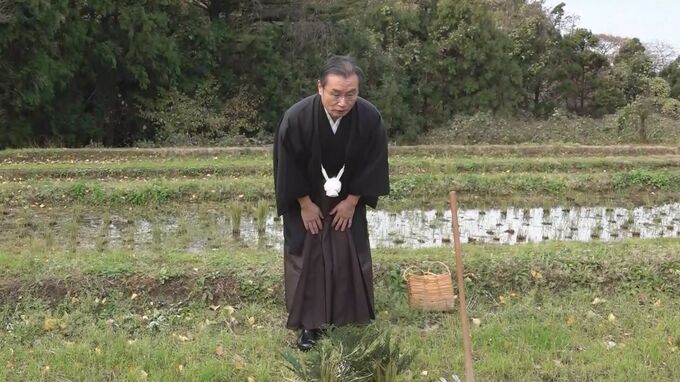 石川県輪島市白米町で行われた「あえのこと」では、主の川口喜仙さんが紋付袴姿で近くの田んぼに神様を迎えに行きます。