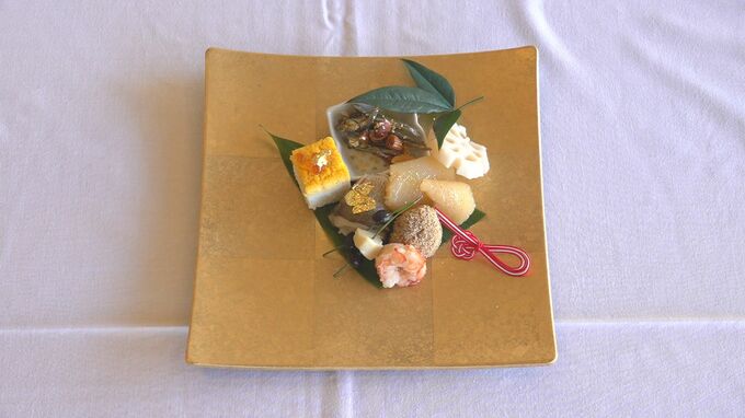 金箔をあしらったプレートなどに「エビの酒蒸し」や「数の子錦玉子」「黒豆チーズ」など8品の正月料理を盛りつけ、オリジナルのおせち料理を仕上げていました。