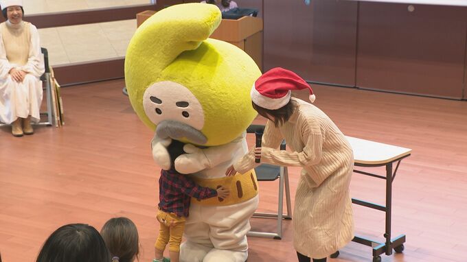 10日は、川瀬裕子・西尾知亜紀・石川映夏のアナウンサー3人がサンタ帽姿でクリスマスやお正月をテーマに大型の絵本4冊の読み聞かせを行いました。