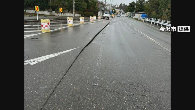 市によりますと、涌波1丁目付近では一部区間で道路ののり面が沈下し、その影響でアスファルトの舗装路面が深さおよそ10センチ沈下、また20メートルほどにわたって道路に亀裂が入ったということです。