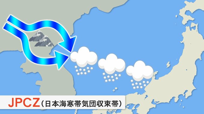 今回のように強い冬型の気圧配置になると、注意したいのが「JPCZ」の影響です。JPCZは日本海寒帯気団収束帯を英語で表記しその頭文字をとって、こう呼びます。