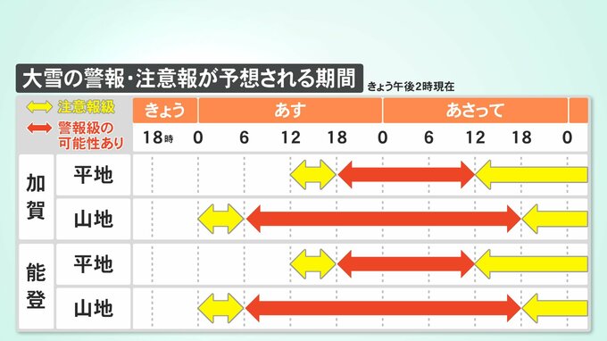 21日午後6までの24時間に降る雪の量はいずれも多いところで、加賀の平地で20センチ山地で60センチ、能登の平地で25センチ山地で40センチの予想です。その後、雪は降り続き、22日午後6時までの24時間では、加賀・能登ともに平地で20センチから40センチ、加賀の山地で40センチから60センチ、能登の山地で30センチから50センチの雪が予想されています。