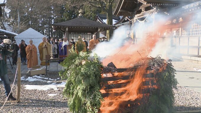 境内では読経の中、持ち寄った古いお札や縁起物を供養して燃やす「お焚き上げ」が行われました。