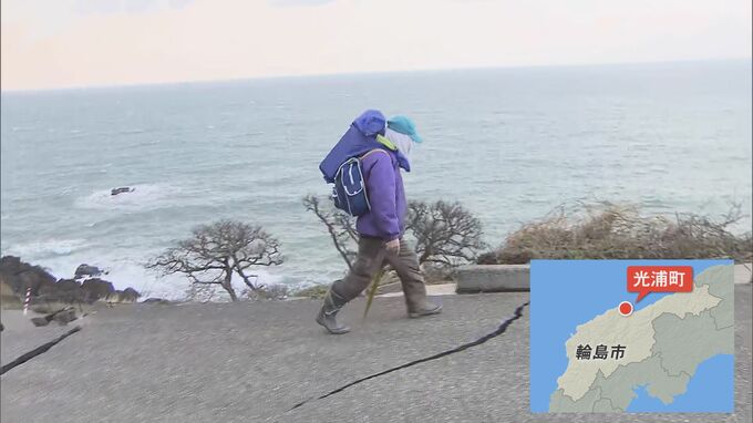 海岸沿いの道路が地震によって大きく崩れ落ち、通行が難しくなっている輪島市光浦町。大きな荷物を背負いながら歩く高齢男性の姿がありました。