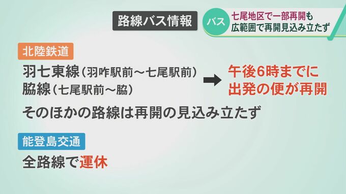 北陸鉄道によりますと、能登地区の路線バスは、羽咋駅前と七尾駅前を結ぶ羽七東線と、七尾駅前と富山県氷見市の脇を結ぶ脇線は、いずれも午後6時までに出発する便の運行が再開されています。そのほかの路線については再開の見込みが立っていません。