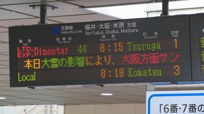 このため、金沢から大阪方面を結ぶ特急サンダーバードは金沢~大阪間の全列車が、米原・名古屋方面を結ぶ特急しらさぎも全列車がきょうの運転を取りやめます。