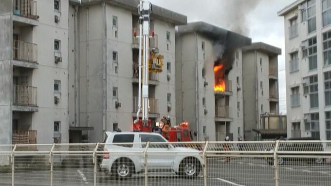 この火事で9号棟の住民3人が病院に搬送されたという事ですが、けがの状況などについては分かっていません。現在、消防が消火活動を行っています。