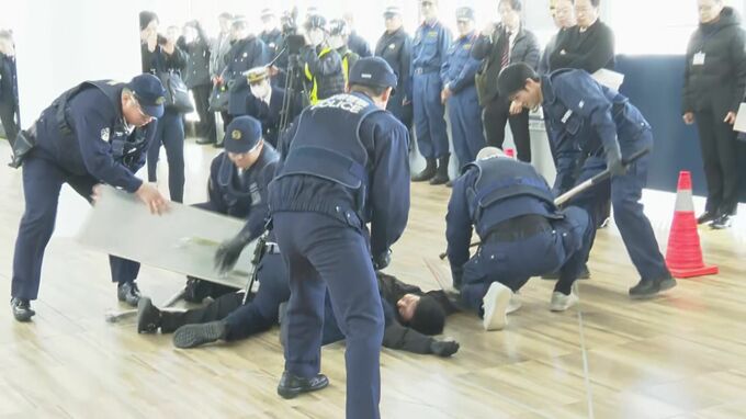 全国的に列車内での事件が相次いでいることから、訓練は敦賀駅に向かう新幹線の車内で不審者が刃物を振り回し人を刺したという想定で行われました。連絡を受けた警備員と車掌が車内に備え付けられている防護盾や手袋などを身につけ不審者を挟み込むことで他の車両に移らないよう対策が取られました。