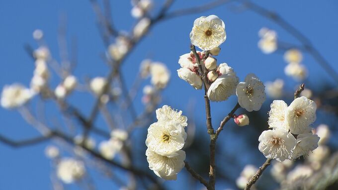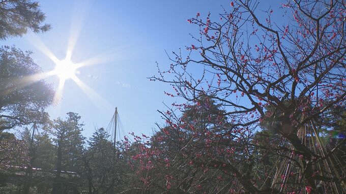 13日の石川県内は高気圧の影響で青空が広がり、季節外れの暖かさとなる見込みです。国の特別名勝・金沢市の兼六園では早咲きの梅が咲き始め、春の訪れを告げています。