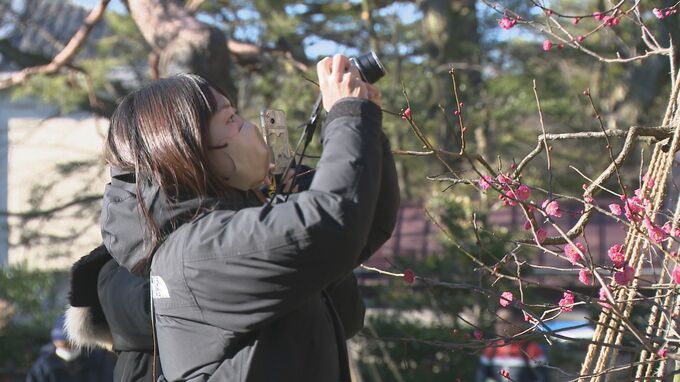 兼六園の梅林には、20種類およそ200本のウメが植えられていて、「白加賀」や「素心蝋梅」など、早咲きの品種が咲き始め、淡い香りが広がっています。このうち「八重寒紅」は、先月21日頃から鮮やかなピンクの花が開き始め、観光客が写真を撮るなどして楽しんでいました。