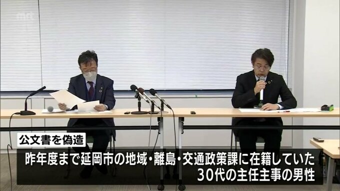 延岡市によりますと、公文書を偽造したのは、昨年度まで地域・離島・交通政策課に在籍していた30代の主任主事の男性です。