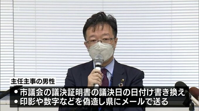 しかし、実際には、県との協議は、市議会の可決後に行われたため、男性は市議会の議決証明書の議決日の日付けを書き換えたほか、印影や数字などを偽造して、県へメールで送ったということです。