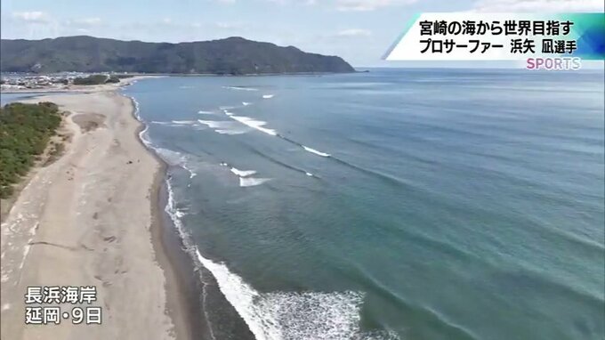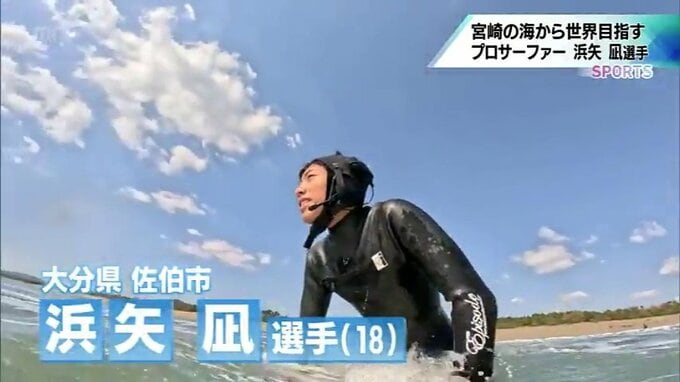 延岡市の長浜海岸にやってきたのは、大分県佐伯市出身のプロサーファー、浜矢 凪選手(18歳)。