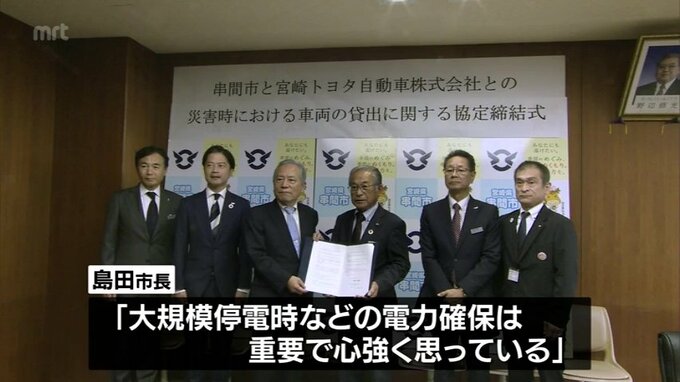 災害発生時に電力供給可能な車両を貸し出し 串間市と自動車販売会社が協定締結 2024年4月4日(木) 12:00 国内 串間市と宮崎トヨタ自動車が、災害発生時、電力の供給ができる車両を貸し出す協定を結びました。3日は、串間市役所で島田市長と宮崎トヨタ自動車の佐土嶋恒夫社長が協定書を取り交わしました。協定では、災害で大…