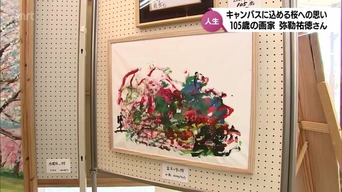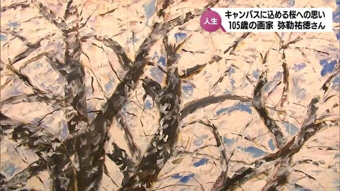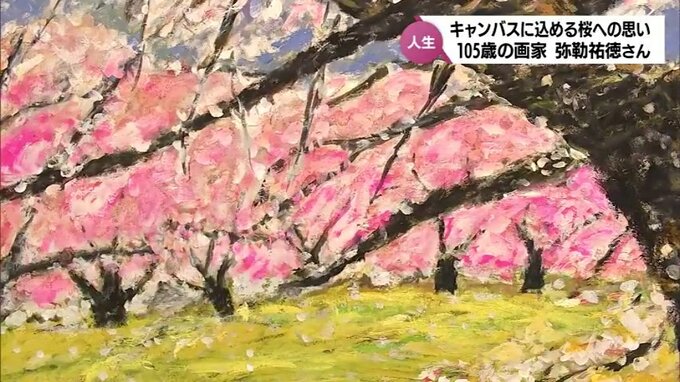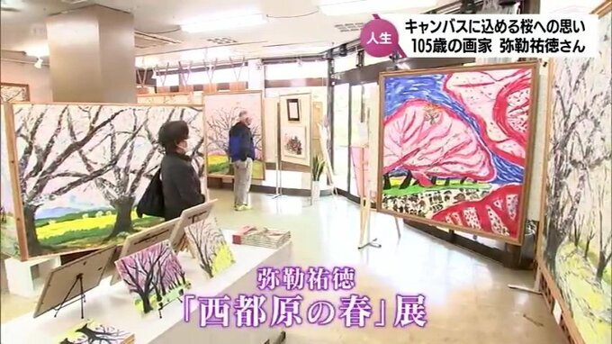 MRT特集 「桜が笑い出す」桜への思いを込めて描く105歳の画家 弥勒祐徳さん 新作が完成 2024年4月11日(木) 12:46 国内 496回目の個展 小さなキャンバスに描かれた桜 新富町で始まった496回目となる弥勒さんの個展には、西都原の桜の作品が数多く展示されています。 大きな作品が並ぶ中、1つ、小さなキャンバスに描かれた桜が。 この作品は、今月、弥勒さんが描き上げたものです。