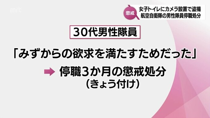 隊員は「自らの欲求を満たすためだった」と話していて、高畑山分屯基地は、隊員を、15日付けで、停職3か月の懲戒処分としました。