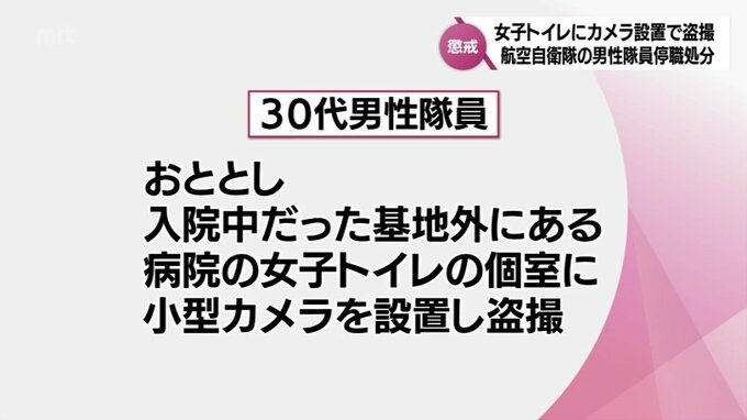 分屯基地によりますと、隊員は、おととし入院中だった基地外にある病院の女子トイレの個室に、小型カメラを設置し、盗撮したということです。