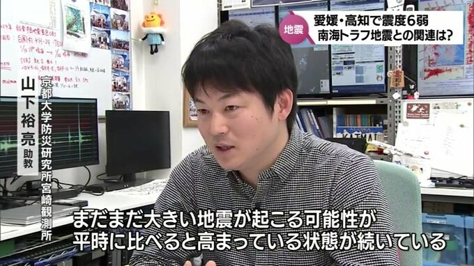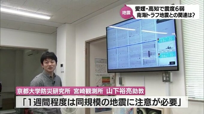 京都大学防災研究所宮崎観測所の山下裕亮助教は、1週間程度は同規模の地震に注意が必要と呼びかけます。