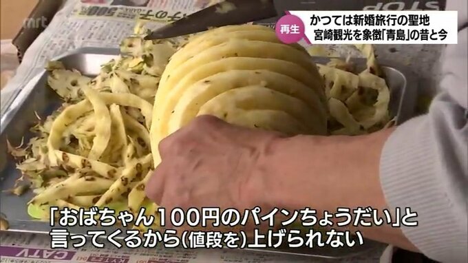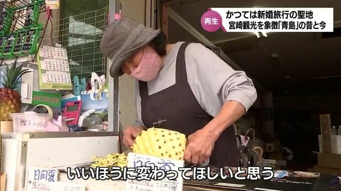 「子どもさんが100円玉を握ってきて、『おばちゃん100円のパインちょうだい』って言って来るから、(値段を)よう上げんとですよね(上げることができない)。(青島は)昔のままじゃいかんし、変わってもらいたいし、良い方に変わってほしいな~って思います」