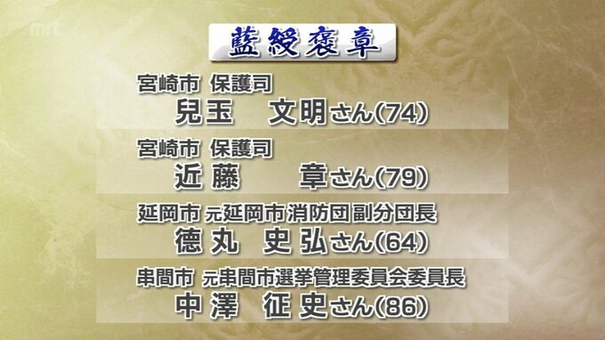 また、社会福祉や公共の仕事などで優れた業績を挙げた人に贈られる藍綬褒章には、いずれも宮崎市で保護司の兒玉文明さん、近藤章さん、延岡市の元延岡市消防団副分団長德丸史弘さん、串間市の元串間市選挙管理委員会委員長 中澤征史さんが選ばれました。