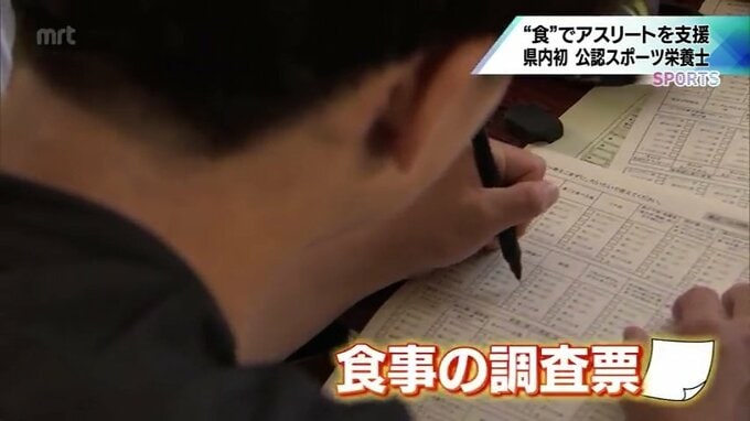 選手が、普段、どんな食事をしているのかを調べ、改善点の指導に役立てます。