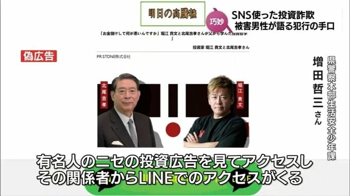 「被害者の多くはインスタグラム、フェイスブックにあげられた有名人のニセの投資広告を見てアクセスして、その後、その関係者からラインでのアクセスが来ます。それで連絡を取るようになって、ニセの投資アプリに誘導されて、その後、何度も現金・暗号資産をだまし取られる手口が多いです」