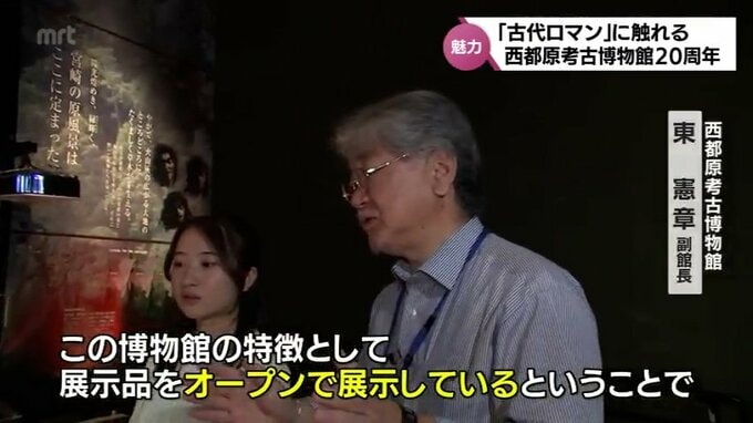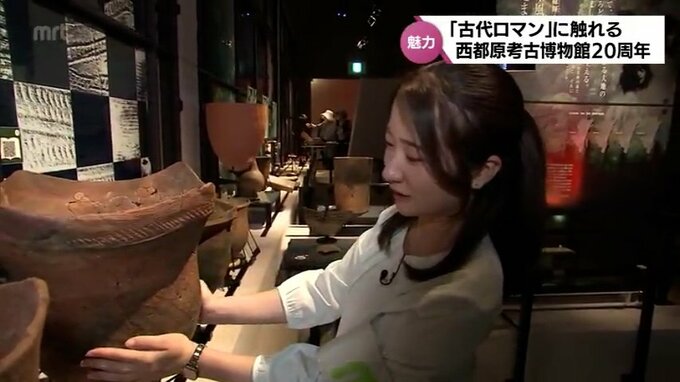 「この博物館の特徴として、展示品をオープンで展示しているということで、実際に展示している土器に触ってもらって、土器の質感を確かめてもらうことができます。どうぞ、触ってください」