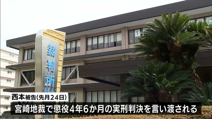 西本被告は、先月24日、宮崎地裁で懲役4年6か月の実刑判決を言い渡されていましたが、宮崎地裁によりますと、西本被告は、判決を不服として7日付けで、控訴したということです。