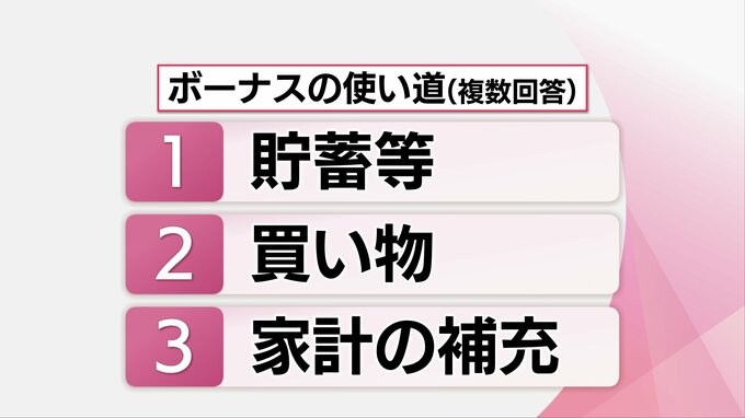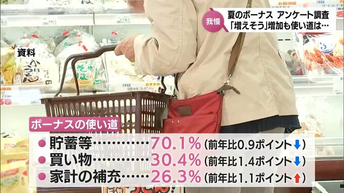 しかし、ボーナスの使い道については「貯蓄」がおよそ70%と最も多く、2位が「買い物」、そして3位は「家計の補充」で26.3%と、前の年より1.1ポイント増加しました。