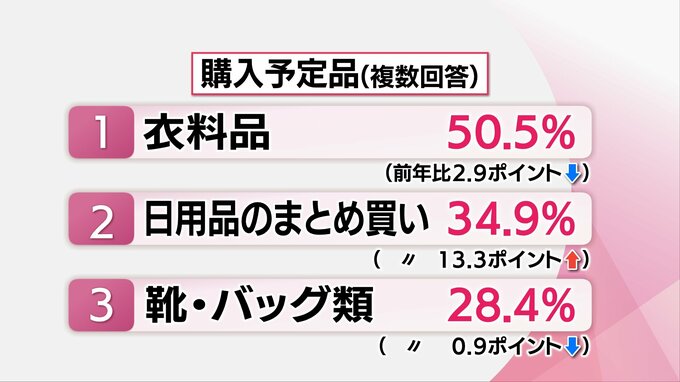 このほか、買い物の購入予定品は、「日用品のまとめ買い」が34.9%とほかの品目と比べて前の年より大きく増加しています。