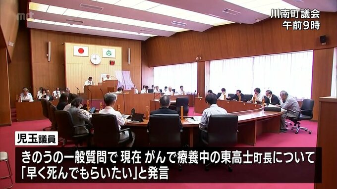 川南町議会の議長によりますと、児玉議員は、12日の一般質問で民生委員児童委員の処遇改善策について質問する中で、現在、がんで療養中の東町長について「早く死んでもらいたい」と発言したということです。