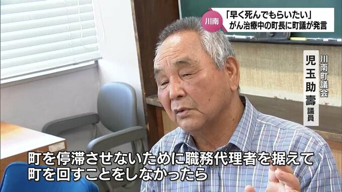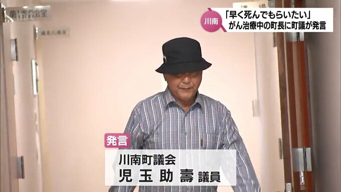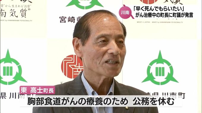 こうした中、川南町議会の河野浩一議長によりますと、12日の一般質問で児玉議員は、民生委員などの処遇改善策について質問をする中で、議会を欠席している東町長に対し「早く死んでもらいたい」と発言したということです。