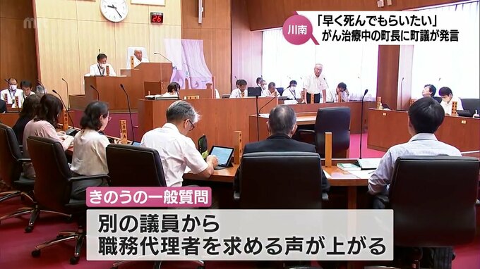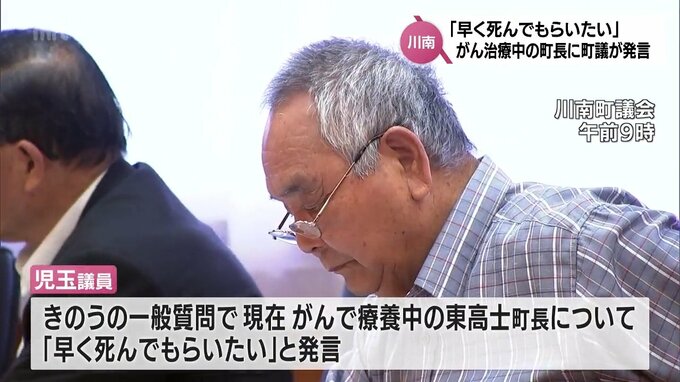 12日の宮崎県川南町議会の一般質問で、男性議員ががんで療養中の東 高士 町長に対して「早く死んでもらいたい」と発言したことが分かりました。