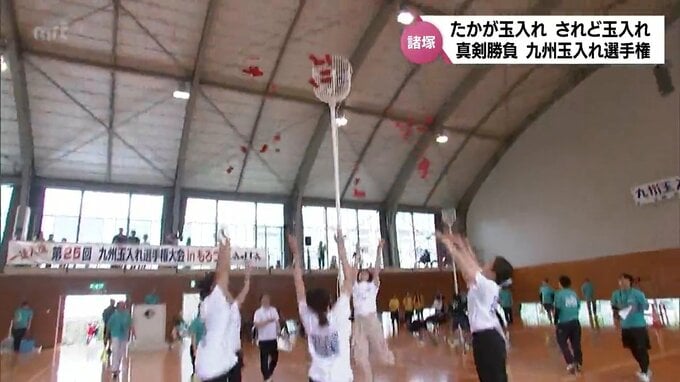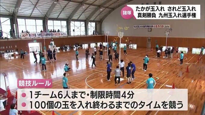 競技は6人までのチームで、制限時間4分以内に100個の玉を入れ終わるまでのタイムを競います。