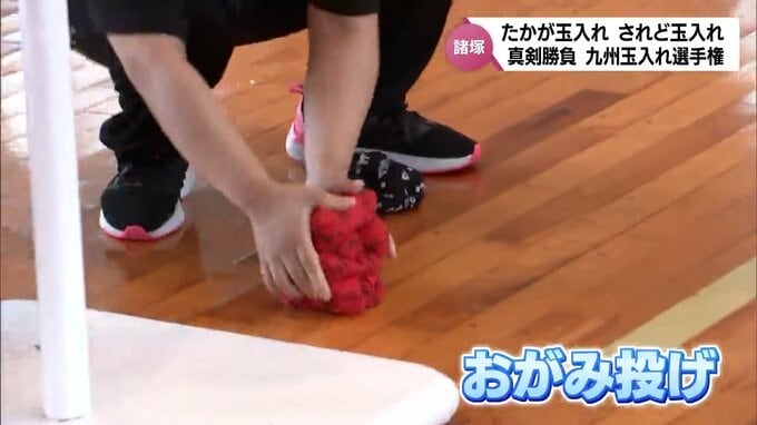 玉入れにはコツがあって、玉を積んで塊にし「おがみ投げ」と呼ばれる投げ方でかごを狙います。