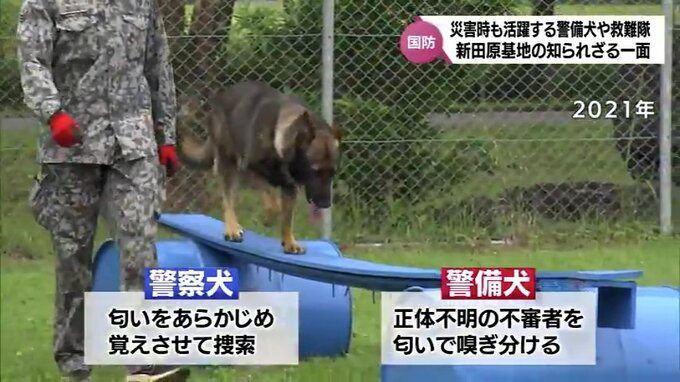 犯人や行方不明者などの匂いをあらかじめ覚えさせて捜索を行う警察犬などとは違い、正体のわからない不審者を匂いで嗅ぎ分ける警備犬。
