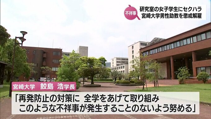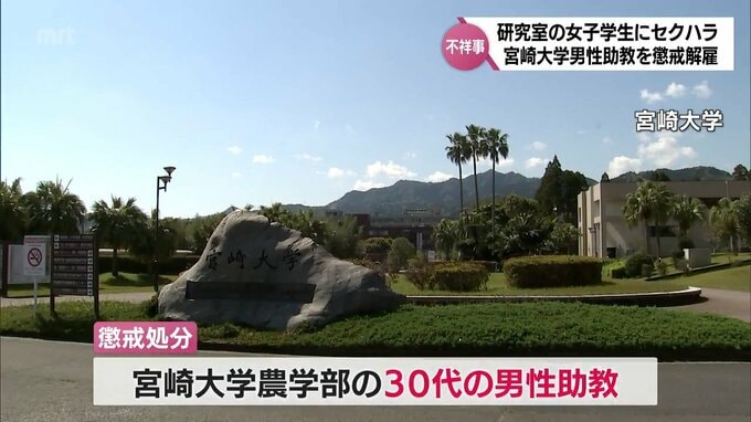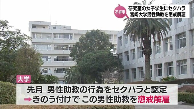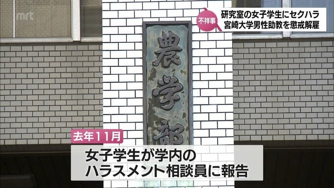 宮崎大学は、女子学生に対し、体を触るセクハラ行為をしたとして30代の男性助教を27日付けで懲戒解雇処分としました。