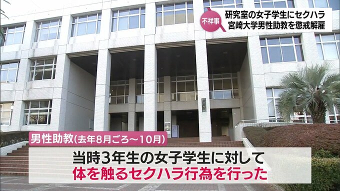 宮崎大学によりますと、この男性助教は、去年8月ごろから10月までの間に、男性助教の研究室に所属していた当時3年生の女子学生に対して、体を触るセクハラ行為をしたということです。