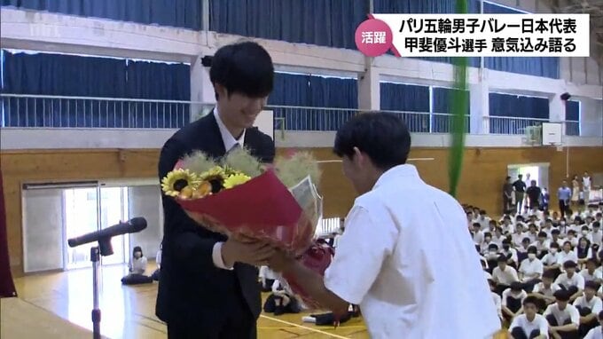 最後には、男子バレーボール部の田中龍司主将から花束が贈呈。